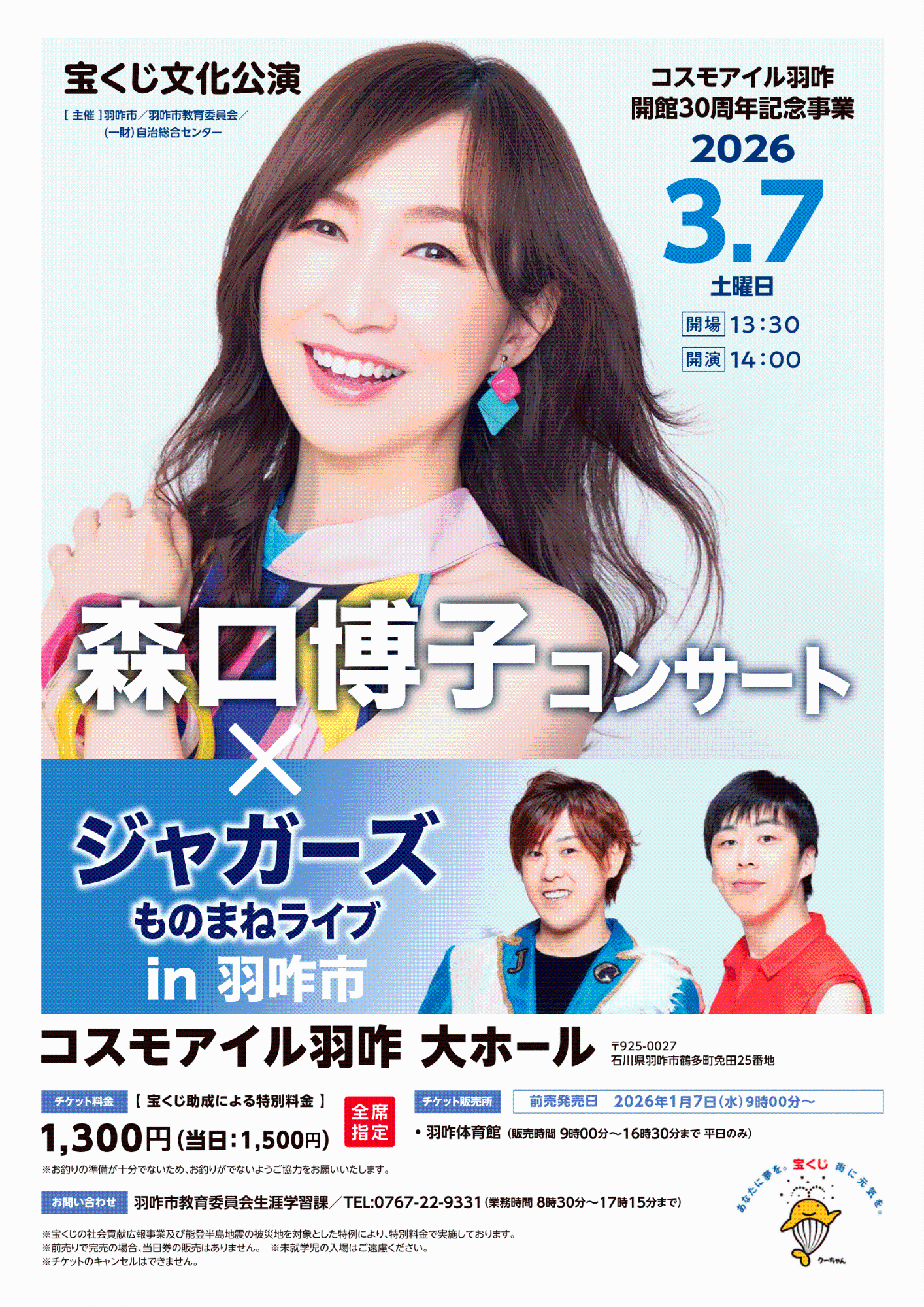 コスモアイル羽咋開館30周年記念事業 森口博子コンサート×ジャガーズものまねライブ