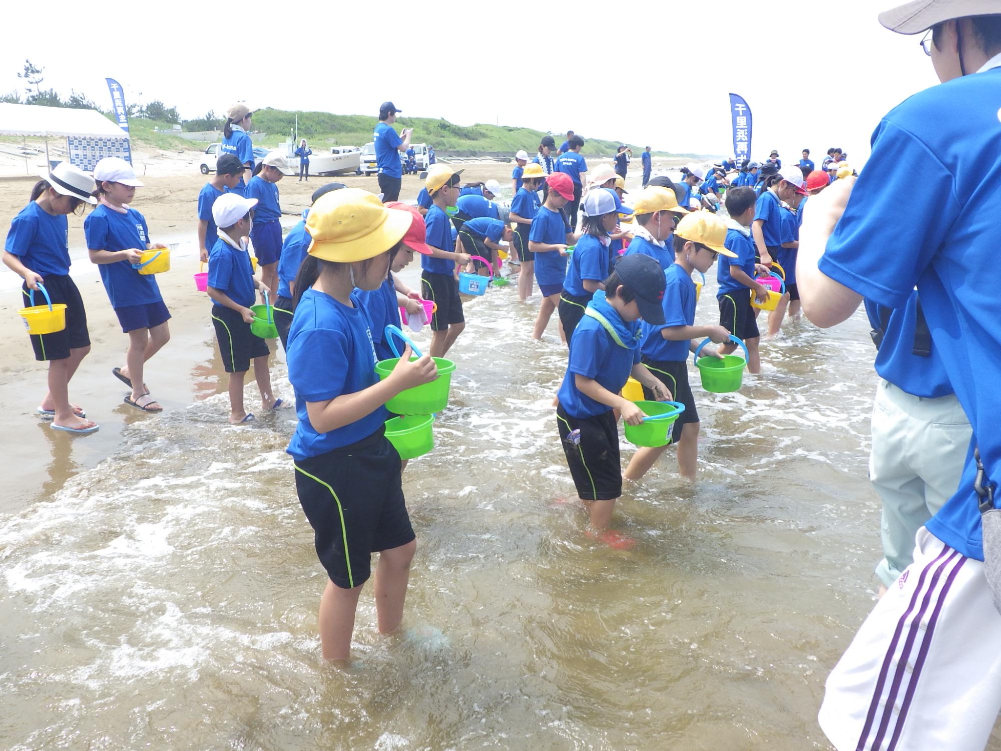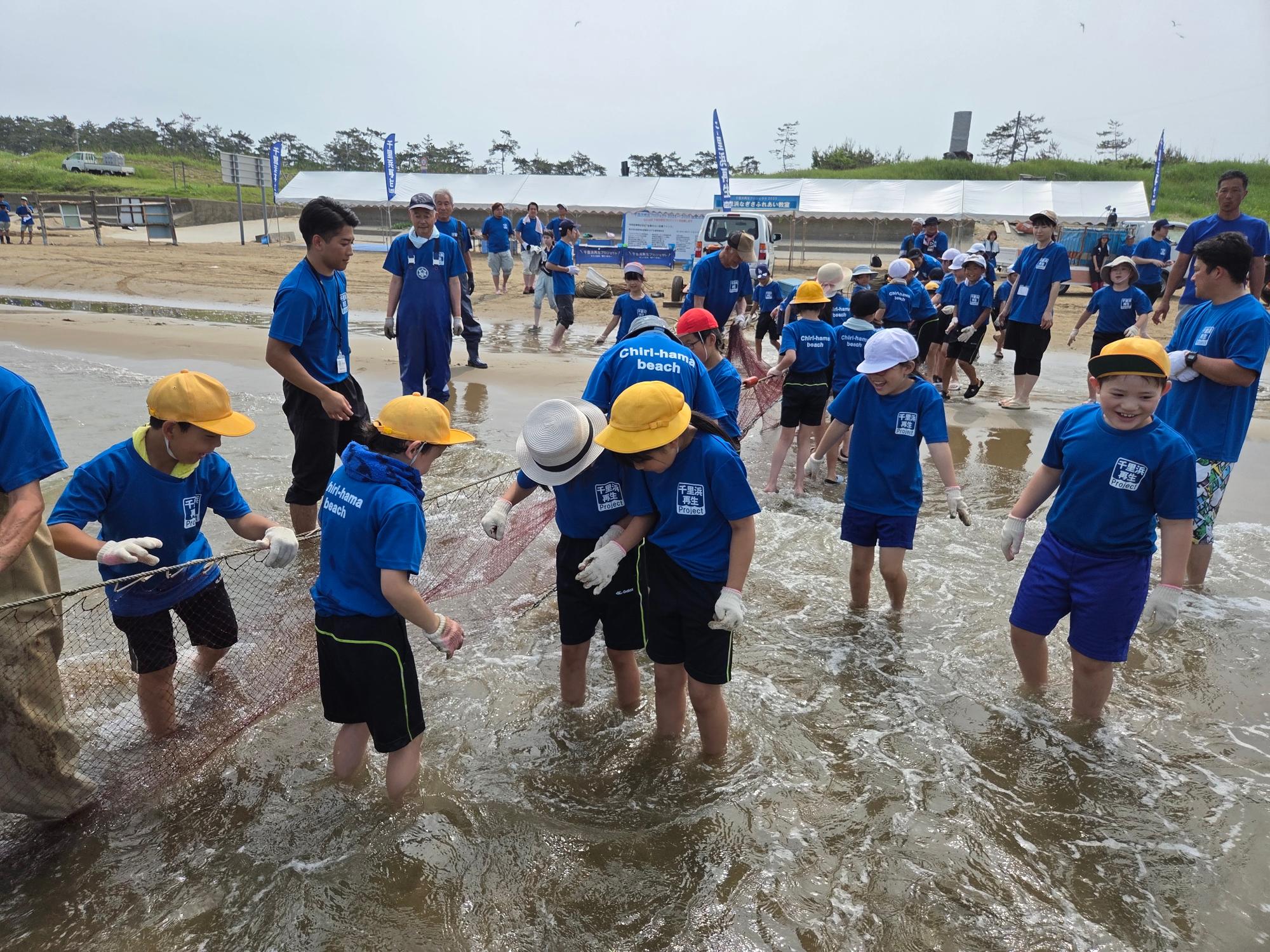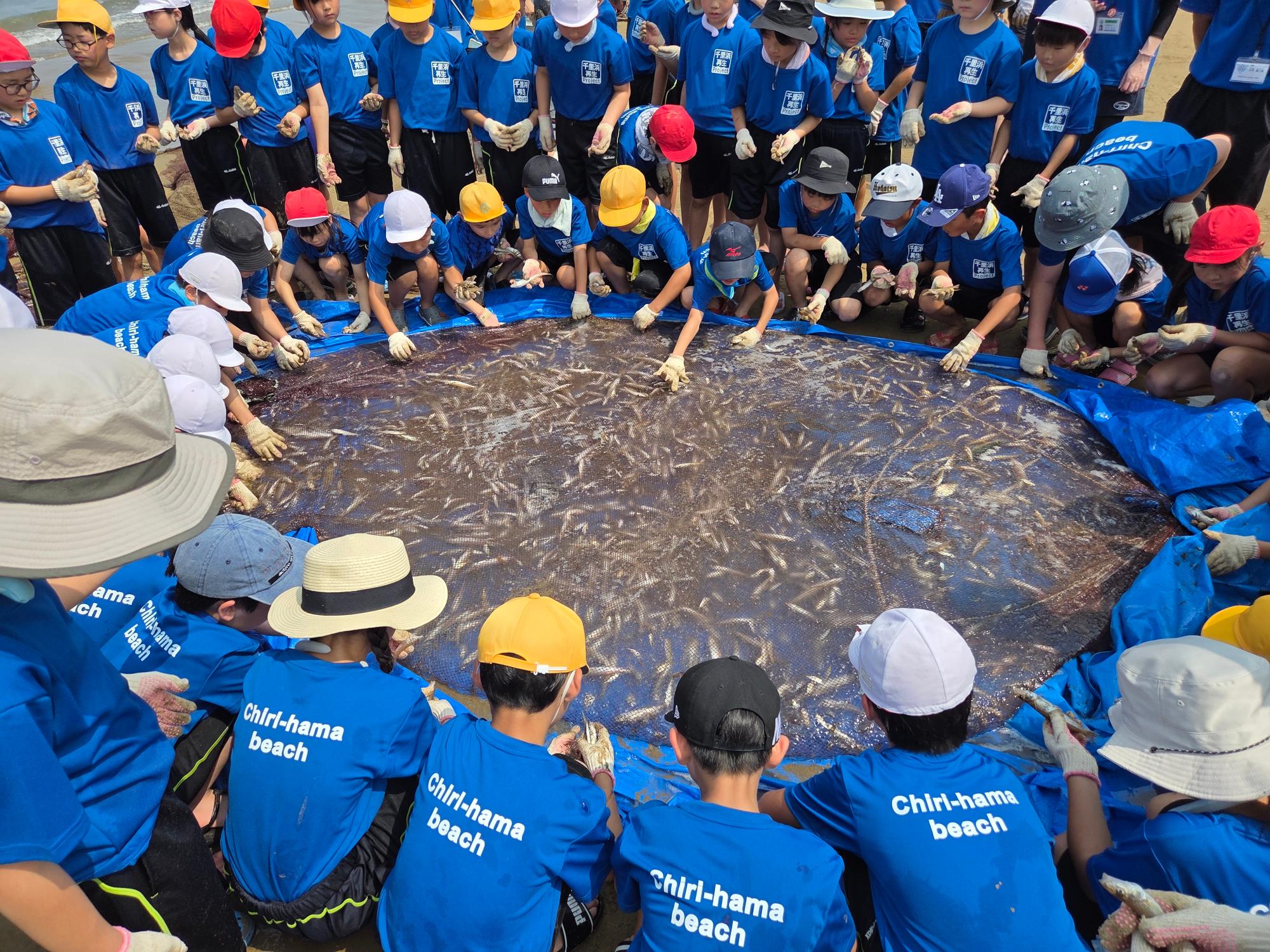 令和7年7月1日(火曜日) に宝達志水町の今浜海岸で開催しました。今回は、押水小学校、志桜小学校から67名の児童のみなさんが参加してくれました。当日は天候にも恵まれ、一人一砂運動、ヒラメの稚魚放流、地引網体験ができました!海辺での活動を通じて、砂浜や海で遊ぶ楽しさや大切さ、千里浜のよさを感じてもらいました。