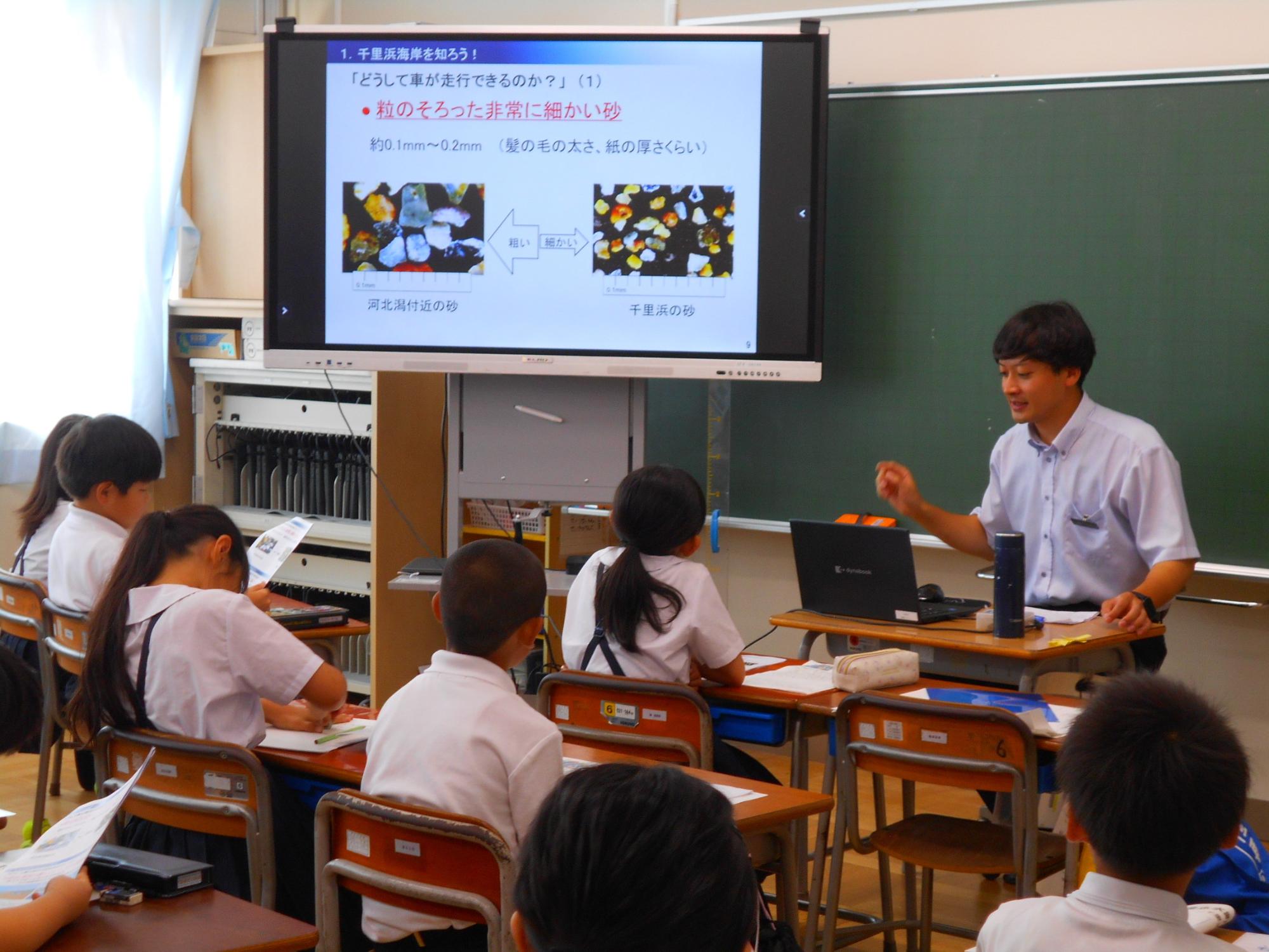 ものしり教室では、今と昔の千里浜についての説明や千里浜を守るための取組についての説明がされました。