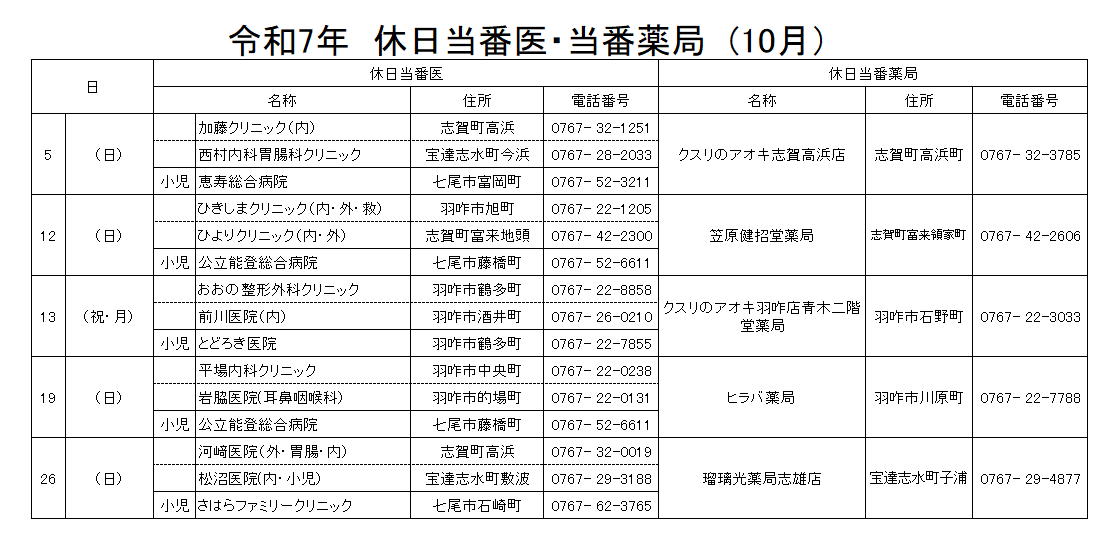 令和7年10月の休日当番医療機関と当番薬局です。