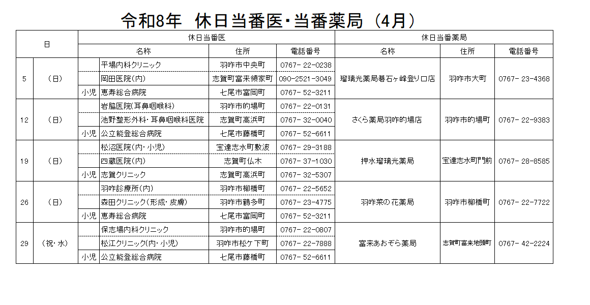 令和8年4月の休日当番医療機関と当番薬局です。