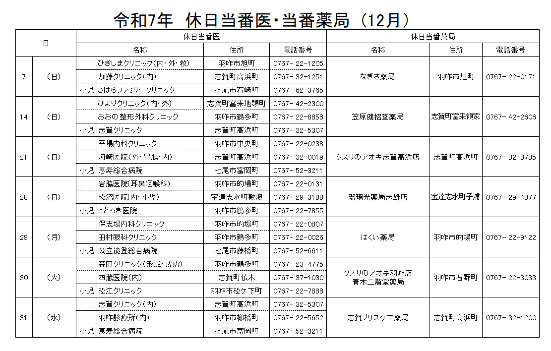 ・小児科の診療については、羽咋郡市の小児科に加え、七尾市の小児科も含め広域化した休日当番医制を実施しています。