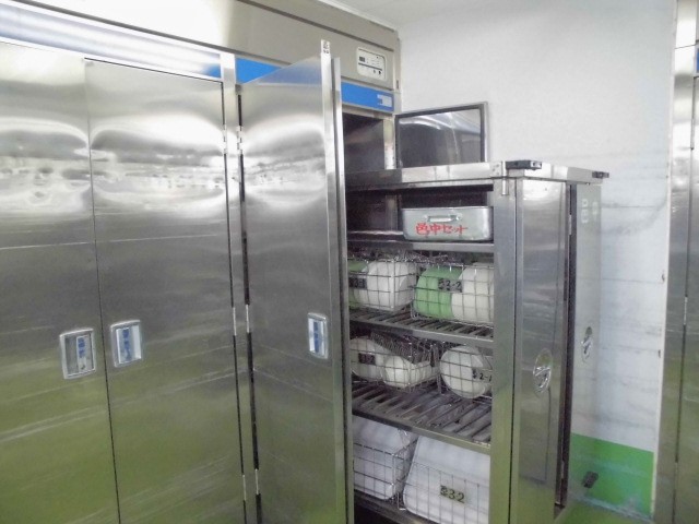 給食が終わると、各学校から返却された食器や食缶をていねいに洗浄し、熱風にかけて乾燥・消毒をします。