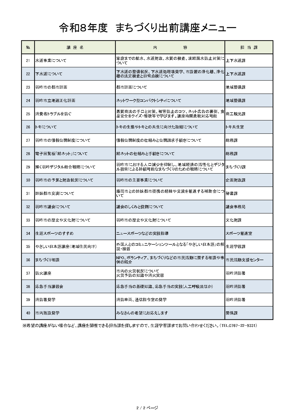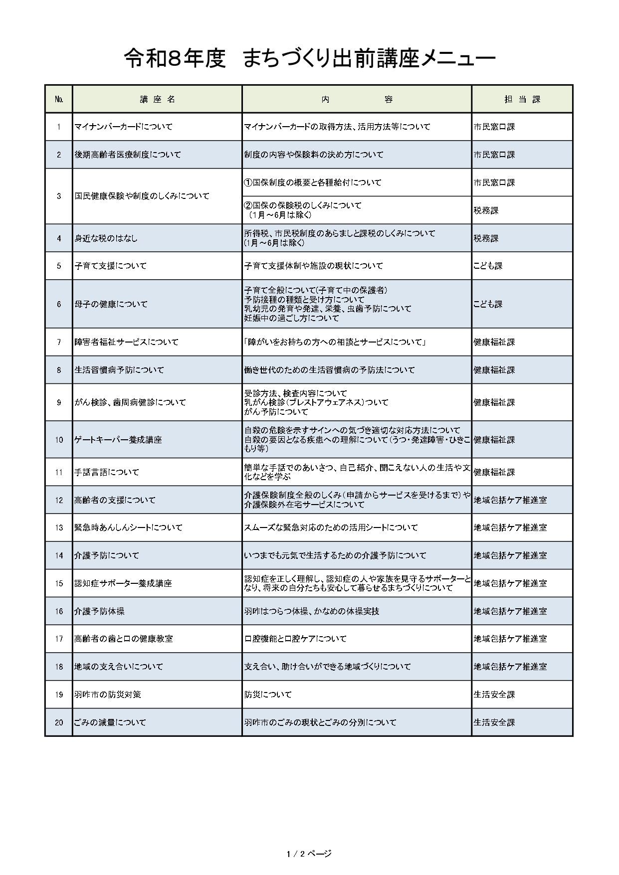 まちづくり出前講座メニュー一覧表