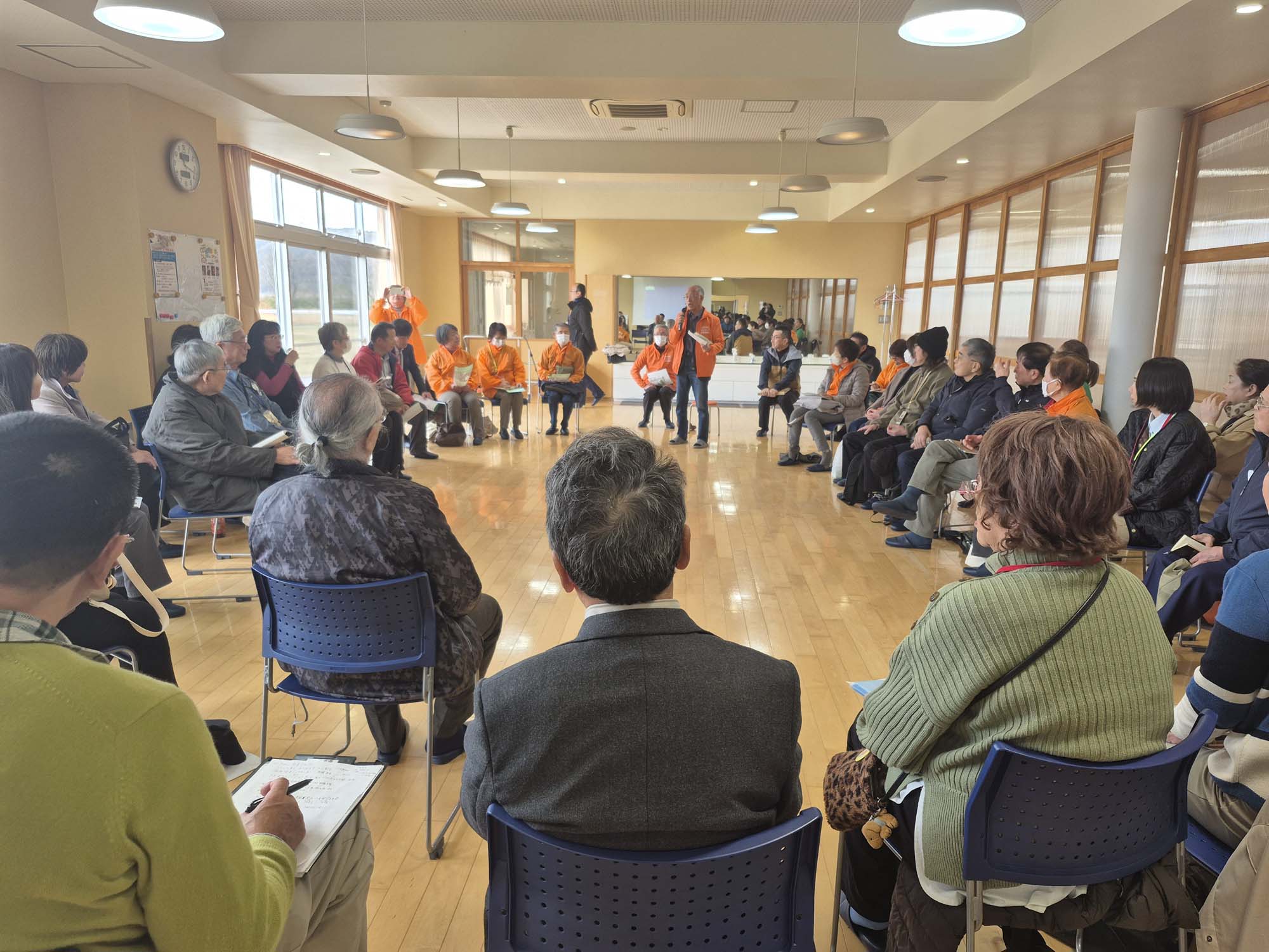 輪になって、トキのガイドのことや観察マナーについて、来訪者へのマナーの伝え方など、意見交換を行いました。