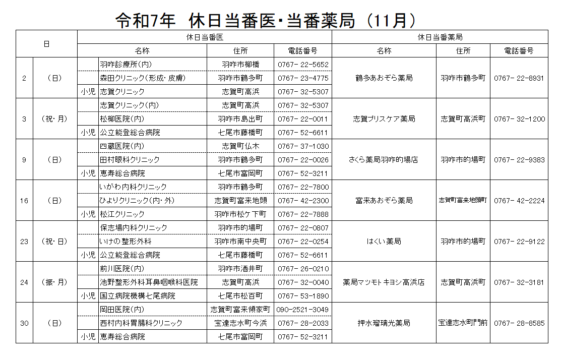令和7年11月の休日当番医療機関と当番薬局です。